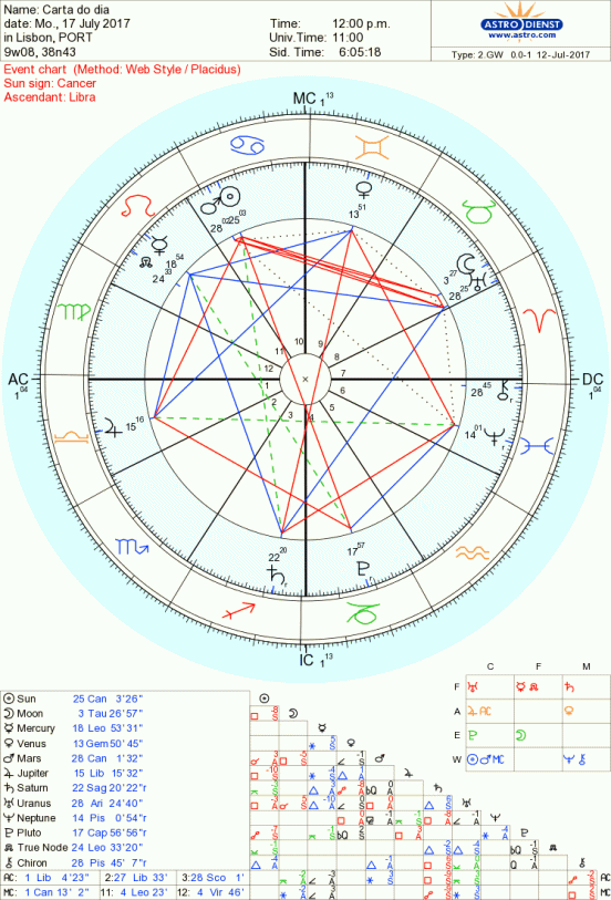 A semana começa tensa já que desejamos estabilidade e segurança mas ela parece ter escapado por entre os dedos, pela dúvida ou por imprevistos com a Lua a entrar em Touro depois de fazer conjunção a Urano em Carneiro e quadratura ao Sol e a Marte em Caranguejo enquanto Vénus em Gémeos, quadrada a Neptuno em Peixes, baralha ainda mais as percepções do que é francamente palpável e realizável ou o que é apenas ambição de ter algo de material para valorizar, para segurar. Toda a semana aliás é de grande tensão porque estamos a caminho de uma série de aspectos que até sexta feira nos levam a ter de deixar dependências e rotinas, velhas amarras emocional, familiares, domésticas. Há mudanças em curso e o melhor é sermos nós próprios a liderar o processo. Com Sol, a Lua e Marte a avançarem para o Leão, com uma Lua Nova no domingo 23, a vida tem de ser o que quisermos ser nós a fazer dela, fora da zona de conforto que desde hoje temos de começar a largar.