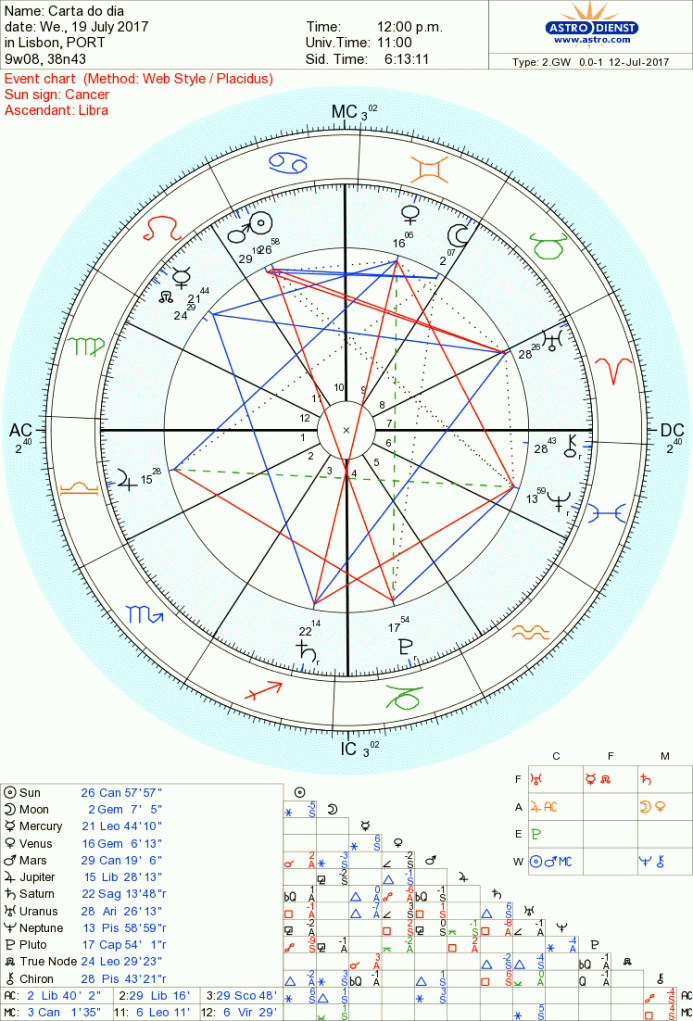 Hoje há muito que ver, descobrir, contactar e a curiosidade está naturalmente estimulada. Queremos uma coisa e o seu oposto e achamos que isso está correcto e nos dá segurança com a Lua e Vénus e Gémeos a abrir-nos para várias opções e relações e o Sol e Marte em Caranguejo, regido pela Lua a exigir que olhemos pelo que é nosso de raíz, a casa, família, tradições para as quais queremos encontrar novas formas de expressão. Essa expressão tem de nos vir do coração, mesmo que seja diferente do que podem esperar de nós, desde que represente um pensamento estruturado, uma razão de peso a longo prazo, com Mercúrio, regente de Gémeos a abrir desde hoje e durante os próximos dias, a partir do Leão -onde faz conjunção ao Nódulo Norte – um grande trígono de Fogo a Urano em Carneiro e a Saturno em Sagitário. Isto quer dizer que o verbo é ir, falar, agir com o sentido, a originalidade e o vigor do ser criativo, aberto a cenários vários que estimulem um novo sentido de pertença. Vamos ter de nos fazer ouvir e pode não ser confortável ou mesmo causar rupturas com Marte e Sol próximos de uma quadratura a Urano mas terá outras compensações graças ao trígono de Vénus a Júpiter em Balança.