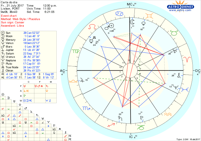 A tranquilidade começa em casa, em família e são as rotinas, o ninho, o conforto do que nos é conhecido que procuramos, exactamente porque lhe sentimos a falta. Estamos numa curta transição até à Lua Nova em Leão na manhã de domingo, com a Lua desde hoje em Caranguejo a iluminar inseguranças emocionais – provocadas pela ruptura com situações de que dependíamos, devido à quadratura do Sol em Caranguejo a Urano em Carneiro- , que têm de ser resolvidas até que a Lua, Sol e Marte se encontrem em Leão, na manhã de domingo lançando as sementes de um novo ciclo de autonomia, criatividade, sentido de quem somos e do que queremos exprimir, com Mercúrio também em Leão. Apesar de ser sempre difícil aceitar mudanças no que de mais íntimo nos suporta, o facto de Mercúrio estar hoje e até à Lua Nova conjunto ao Nódulo Norte em Leão e trígono a Urano em Carneiro e Saturno em Sagitário cria uma lógica de futuro, de diferença, de perspectiva do que nos deve orgulhar que vai facilitar ultrapassar as carências e inseguranças que se apresentarem até à Lua Nova. a chave do dia está em pensar bem, a longo prazo, o que queremos ou quem queremos ser.