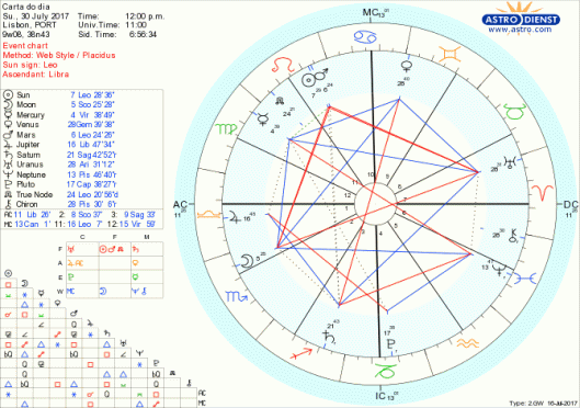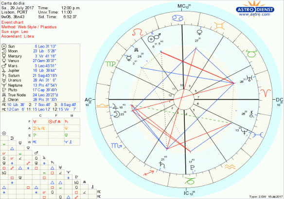 Encontros inesperados, surpresas nos relacionamentos, quebras de rotina na paz das coisas é o que nos espera no sábado e consequentemente, no domingo o que mais desejamos é restabelecer o controlo das situações, relações, bens e poderes. No sábado, a Lua em Balança, depois da quadratura a Plutão em Capricórnio, faz oposição a Urano em Carneiro e trígono a Vénus em Gémeos o que nos proporciona as alterações à rotina porque algo de diferente vem ter connosco ou nós mesmos o procuramos, com Marte e Sol conjuntos em Leão a estimular a afirmação da nossa identidade. No domingo, a Lua entra em Escorpião, tornando todas as emoções mais intensas porque sentimos que algo escapa ao nosso domínio e isso é factor de perturbação, mais ainda porque desde a véspera Vénus está em quadratura a Quíron em Peixes acentuando insatisfações, sentido de desamor ou falta de compreensão. É possível que sejam as nossas próprias oscilações que provoquem essa carência de eco já que Vénus também faz sextil a Urano e Mercúrio em Virgem, regente do Gémeos onde Vénus se encontra está em sesquiquadrado a Plutão. Se formos demasiados críticos ou dispersos nos detalhes a organizar ou negociar não chegamos a lado algum.