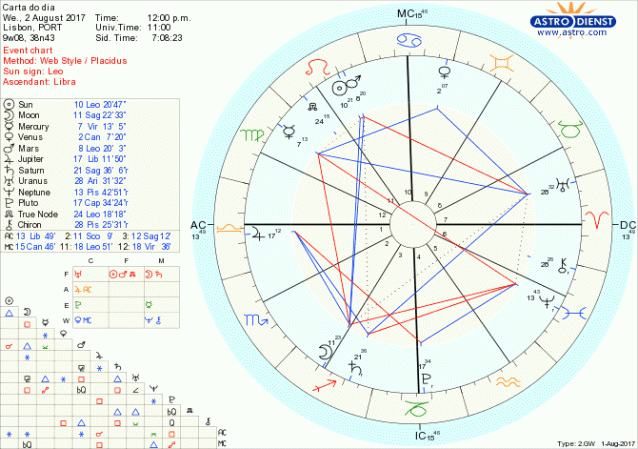 Hoje é um daqueles belos dias em que o sonho pode comandar a vida porque temos meios e vontade para pôr em prática o que desejamos por mais especial que seja, desde que corresponda à nossa verdade e às aspirações de futuro. Mas tem que ter resultados práticos. Podemos também contar com apoios para isso, o todo graças à Lua em Sagitário em trígono a Marte em Sol em Leão, em quadratura a Neptuno e em sextil a Júpiter em Balança. Claro que podemos estar a fantasiar um bocado mas é de aproveitar hoje porque amanhã de manhã já a Lua faz conjunção a Saturno e as aspirações têm de ser ainda mais pragmáticas. Mercúrio em Virgem garante a atenção aos detalhes, à arrumação, e ao sentido do que se faz, ao cuidar de nós próprios e das coisasassim como o grande trígono de Fogo entre Saturno, Urano e o Nódulo Norte dá o ímpeto para nos afirmarmos de forma independente, inteligente, estruturada. É preciso fazer qualquer coisa de útil com todos estes bons aspectos.