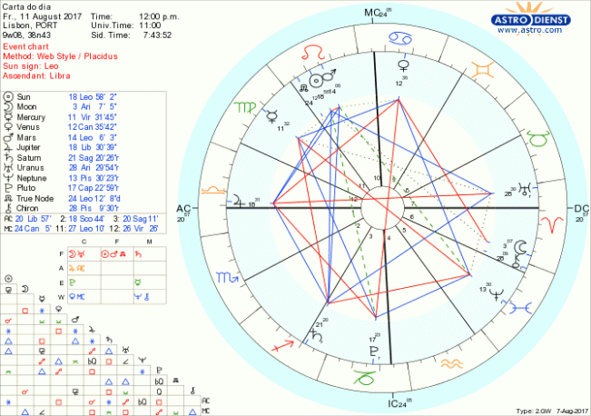 O desejo de acção é o que nos move hoje e é com o coração alinhado com a perspectiva a longo prazo que nos empenhamos em conquistar novos mundos e estabelecer novas alianças graças à Lua em Carneiro a avançar amanhã para um trígono a Marte, Sol e Nódulo Norte em Leão e a Saturno em Sagitário e Júpiter em Balança em sextil a Saturno e ao Sol e a Marte. E o que desejamos? Desejamos estabilidade emocional através da criação de novas estruturas de relacionamento pessoais e profissionais a que damos toda a atenção com Vénus em Caranguejo oposta a Plutão em Capricórnio e sextil a Mercúrio em Virgem. Como Vénus está em trígono a Neptuno em Peixes os afectos e a criatividade estão exacerbados. Nesta sexta-feira podemos tornar os sonhos em realidade. Inspirar e ser inspirado, acreditar, decidir, agir e aceitar que é preciso largar coisas do passado para viver a nova realidade são a extraordinária combinação de aspectos que agora se manifesta, em preparação desde já para o grande eclipse do Sol no próximo dia 21 com novas metas a substituir velhos hábitos.