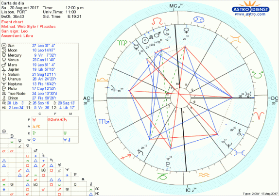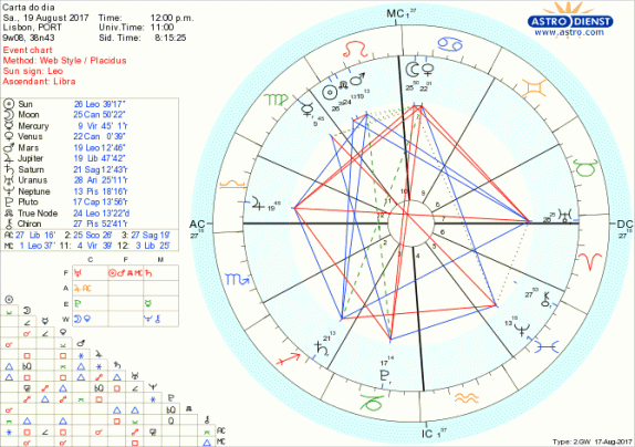 No domingo mantêm-se os aspectos que estabilizam identidade, estrutura e iniciativa com o grande trígono de Fogo entre Marte, Nódulo Norte e Sol em Leão, Urano em Carneiro e Saturno em Sagitário enquanto a Lua, já entrada em Leão, avança para a conjunção ao Sol e eclipse na segunda. Domingo é assim o prelúdio de um novo ciclo de autoridade, sucesso, honra, fama mas que, para que aconteça tem de ser precedido por quedas, fracassos, abandonos, derrotas. Este eclipse é conjunto as estrela Régulus, trígono a Urano e são de esperar eventos que ponham ou deponham de posições de poder quem tiver planetas pessoais ou ângulos do horóscopo em torno dos 29 graus de Leão. É um fim de semana para nos interrogarmos sobre quem queremos ser, qual a verdade que nos move e que iniciativas podemos tomar para que o coração comande a vida. Depois vem o eclipse para pôr tudo em andamento….Olhos postos na escuridão dos EUA, a zona do globo mais afectada pela rota de Luz e Sombra deste eclipse.