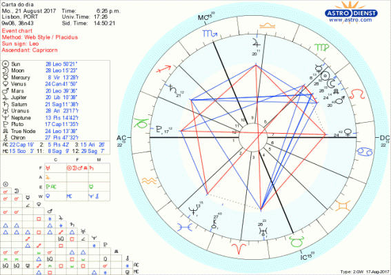 Hoje é o dia do grande eclipse do ano, um eclipse total do Sol a 28 graus de Leão, uma Lua Nova de enorme potência que nos coloca num novo patamar de consciência de quem somos, como queremos agir, com que apoios, com base em que ideias e que iniciativas originais. Marte, Nódulo Norte, Lua e Sol estão em Leão, em sextil a Júpiter em Balança, trígonos a Saturno em Sagitário e a Urano em Carneiro, fortíssimos aspectos de Fogo, de acção que nos torna donos de nós próprios, responsáveis pelos nossos actos e pela revelação do que de mais criativo, amoroso, tivermos para dar. Luz e sombra sobre amor e narcisismo, espírito e agressividade, generosidade e egocentrismo são alguns dos ângulos que se vão revelar individual e colectivamente neste grande eclipse que marca finais e começos de estados do ser e de épocas. Quem pode o quê é a grande questão que este eclipse levanta. Este eclipse é total sobre os Estados Unidos e conjunto ao ascendente de Donald Trump. Veremos o que mais será revelado sob a sombra que projecta sobre outros países já que este eclipse é um eclipse de tomadas de poder.