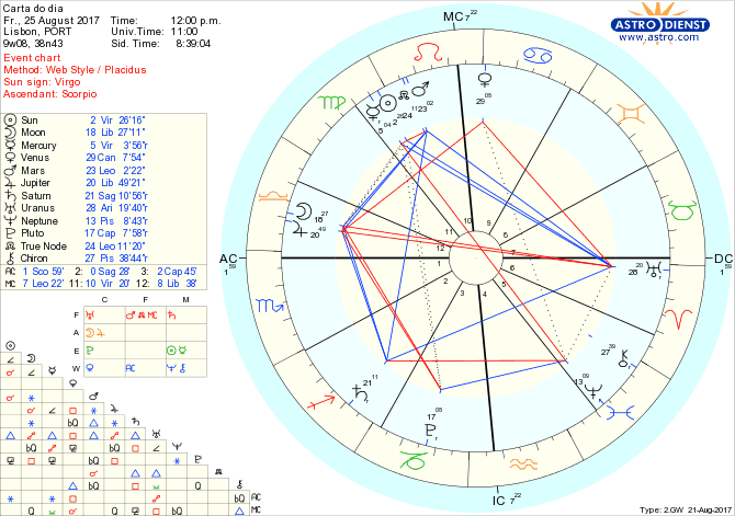 Não é dia para estar sozinho e os contactos, encontros, negociações são fonte de surpresas ou de reviravoltas inesperadas. A Lua conjunta a Júpiter em Balança estimula a importância dos relacionamentos pessoais, financeiros, profissionais ou políticos, onde projectamos o nosso empenho em resolver assuntos, organizar agendas, rever contas ou lógica de serviço ou questões de administração pendentes com Marte e Nódulo Norte em Leão em sextil à Lua e o Sol seu regente em Virgem, conjunto a Mercúrio retrógrado. Os resultados vão ser bons porque Saturno entra estacionário a caminho de deixar a retrogradação em Sagitário que dura desde Abril. Como também Plutão está retrógrado desde Abril e entra directo daqui a um mês, no final de Setembro, a mensagem é simples: Agora que temos as ideias arrumadas sobre como nos vamos expandir, podemos começar a definir as estruturas necessárias para pôr em marcha uma nova ordem depois de 29 de Setembro. Poder para o fazer não vai faltar quando Júpiter entrar em Escorpião a 11 de Outubro. Vamos hoje começar por ver com quem vamos estar a fazer coisas no futuro próximo.