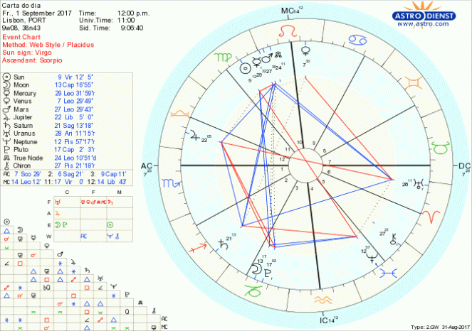 É difícil que tudo fique na mesma hoje e o mais provável é sermos obrigados a olhar para as estruturas de que dependemos ou com que inter-agimos sob uma nova perspectiva, mesmo que custe ou que nos queiramos agarrar ao passado. A Lua está em Capricórnio onde faz conjunção a Plutão, estímulo à compulsividade, a algum dramatismo e a grandes reviravoltas na ordem das coisas, com o que era, a deixar de ser e, o que vai ser, a surpreender-nos porque não sabemos o controlo que temos dos processos, apenas que algo está a mudar. Tudo isto é amplificado através das relações com os outros, com a Lua e Plutão a fazerem quadratura a Júpiter em Balança, mas o que queremos mesmo é defender quem somos, o nosso próprio sentido de identidade com Vénus, regente da Balança em Leão, assim como uma conjunção de Marte, Nódulo Norte e Mercúrio retrógrado, trígonos a Urano em Carneiro. Trabalho, saúde ou questões de serviço estarão certamente no centro das atenções com o Sol em Virgem e a grande questão é de como integramos – ou não – os nossos esforços com os de quem nos rodeia, devido à semi-quadratura do Sol em Virgem a Júpiter em Balança- mas não é preciso fazer nada de definitivo já hoje – Mercúrio está retrogrado até dia 6 e até lá é melhor reflectir sobre a lógica pessoal que seguir nos encontros e desencontros da vida pessoal e profissional. O trígono de Saturno em Sagitário aos planetas em Leão é um bom indicador de que beneficiamos com uma estratégia a longo prazo que inclua a avaliação do lugar de cada um no puzzle em construção. Sem pressa, mas com precisão.