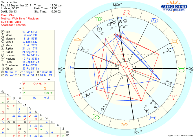 Solidificar a ideia de quem somos, estruturar relações amorosas e criativas e definir investimentos a longo prazo torna-se mais fácil hoje desde que sejamos capazes de não nos dispersar entre as várias opções que se nos apresentam. Estamos, com sentido crítico, a trabalhar, a analisar, a contabilizar, a servir um qualquer propósito com o Sol, Marte e Mercúrio em Virgem e apostamos na nossa capacidade de relacionamento para atingir objectivos, com Vénus em Leão, conjunto ao Nódulo Norte, em sextil a Júpiter em Balança. Como Saturno em Sagitário está em trígono a Vénus e ao Nódulo tudo parece fluir, sem obstáculos, no sentido de, com ideias claras sobre princípios e regras a seguir, conseguirmos afirmar essa força criativa sem que o orgulho perturbe o sentido de realização. O grande esforço a fazer é o de não desencorajarmos ou dispersarmos com a oposição da Lua em Gémeos a Saturno em Sagitário que nos força a sintetizar as opções ou interesses contraditórios que nos distraem de uma perspectiva única de progresso. Há que viver esta oposição como a sorte de podermos escolher e não como a repressão de ideias. Urano em trígono a Vénus dá-nos a certeza que vamos escolher sem dificuldade uma terceira via, original, inteligente, livre para mostrar do que somos capazes e também a possibilidade de sermos surpreendidos com novos relacionamentos..