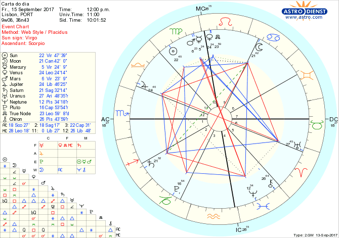 Entregarmo-nos aos prazeres da mesa, das companhias, dos gastos fúteis pode hoje custar caro apesar da tentação. São vários os aspectos que apelam à indulgência dos sentidos sendo o mais potente o sextil de Vénus em Leão a Júpiter em Balança, apoiado num trígono de Vénus a Urano em Carneiro que dá abertura a surpresas nos relacionamentos, mais ainda com a Lua em Caranguejo quadrada a Urano e trígono a Neptuno em Peixes que traz rupturas por irmos atrás de fantasias. Mas há um grande travão que é a quadratura do Sol em Virgem a Saturno em Sagitário e que nos mostra os limites de actuação já que fundamentalmente há que trabalhar e ter as ideias claras, focadas no longo prazo e não na satisfação imediata. O trígono do Sol a Plutão reforça a necessidade de apostarmos em aprofundar o que pode ser mudado em termos de organização de trabalho e o trígono do Nódulo Norte em Leão a Saturno também encoraja os bons princípios e uma actuação exemplar. Em suma, um dia em que não é a satisfação imediata que deve ser saciada mas durante o qual devemos sim pensar e agir em prol de um melhor serviço e melhores resultados com Mercúrio e Marte conjuntos em Virgem.