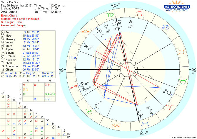 Há que ser realista, muito realista…Não há hoje lugar a fantasias, sonhos, especulações, manobras evasivas, projecções de grandeza ou de possibilidades sem fim. Não é que não aspiremos a ir mais longe, aprender, abrir horizontes, mas isso só é possível se assente em bases de grande realismo, com cálculo de limites e responsabilidades e uma ideia clara onde se pretende chegar a longo prazo. A Lua está em Sagitário, conjunta a Saturno, quadrada a Marte e a Mercúrio em Virgem e também a Neptuno em Peixes antes de outra quadratura a Quíron também em Peixes, aspecto que promete que dói se não baixarmos as expectativas e pensarmos também no que temos para dar em lugar de nos fixarmos nas carências. Com Sol e Júpiter em Balança e Vénus que a rege em Virgem conjunta a Marte ambos regidos por Mercúrio que também está em Virgem, é o serviço das relações pessoais, financeiras, profissionais, políticas que nos consome. As dificuldades de gestão emocional e relacional são agravadas pela oposição de Júpiter a Urano em Carneiro, num crescendo até ao final da semana quando Plutão também entra directo. A questão que este aspecto levanta é se devemos avançar em conjunto ou individualmente e é difícil mas desejável encontrar um meio termo que satisfaça simultaneamente a impaciência para largar tudo e a atracção para formar parcerias. Marte em trígono a Plutão aconselha desde já a trabalhar seriamente todas as questões.