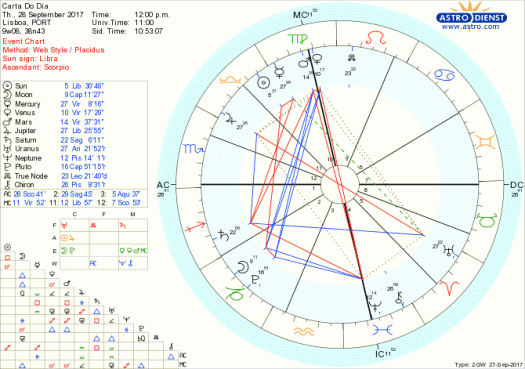 É um arranque lento e pode ter imprevistos mas as mudanças de fundo na organização de vida começam a acontecer a partir de hoje e serão quanto mais fáceis quanto formos capazes de rever projectos e ambições porque nem sempre o que queremos da vida é o que ela nos oferece… Tudo o que estava desde Abril em preparação, revisão, compasso de espera na área dos poderes partilhados, estrutura profissional, organização financeira, controlo das coisas, – quando Plutão entrou retrógrado- vai agora começar novamente a mexer com Plutão a partir de hoje em moção directa e com uma conjunção à Lua e trígono a Marte em Virgem- óptimo aspecto para conquistarmos poderes, fazermos acontecer, transformarmos a ordem das coisas, através de acção cuidada mas determinada, com o olhar crítico e algum desapego que Mercúrio e Vénus em Virgem permitem. Como o Sol está em Balança, assim como Júpiter, procuramos no fundo tomar conta dos assuntos sem deixar de ter relações equilibradas e chegar a uma maior audiência mas como Júpiter está oposto a Urano em Carneiro – e tem estado nestes últimos tempos – a tendência é para oscilarmos entre seguirmos em frente sem olhar para o impacto ou procurar consensos. A única maneira de resolver a polaridade é apoiarmo-nos nos bons aspectos de ambos a Saturno em Sagitário e agir apenas com base em projectos a longo prazo, de ideias claras com regras bem definidas. Um trígono de Saturno ao Nódulo Norte em Leão dá-nos a abertura para exprimirmos assim do que somos capazes. É tempo de tomar os assuntos em mão.