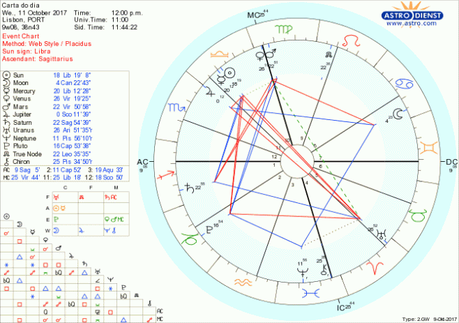 Só podemos contar com a intuição hoje para nos guiar em águas turbulentas, vagas de emoções que pedem uma análise clara e detalhada, difíceis de avaliar e que prolongam os desequilíbrios das relações que tanto queremos restabelecer. A Lua em Caranguejo, trígono a Júpiter em Escorpião e a Neptuno em Peixes é o que catalisa uma hipersensibilidade que permite navegar a possibilidade de repensarmos o que partilhamos e como, para satisfazer sonhos e ideais. Mas o Sol e Mercúrio ainda estão, como ontem, em Balança, em quadratura a Plutão em Capricórnio, destabilizando a ordem das coisas e forçando a reformulação de compromissos pessoais, financeiros, políticos que devem ser cuidadosamente trabalhados com Vénus e Marte em Virgem em trígono a Plutão, com cabeça fria e sem esperar gratificações, pela sua quadratura a Saturno em Sagitário.Um quincúncio de Vénus e Marte a Urano em Carneiro é indício de como todas as iniciativas individuais,espontâneas, de ruptura, chocam com os pormenores de serviço, uma dificuldade a acrescentar à frustração quadratura de Marte a Saturno. Em resumo, um dia delicado em que devemos ouvir o instinto para poder fazer caminho na vaga de complicações e frustrações que surgirem na busca de novos equilíbrios na gestão entre que é da nossa responsabilidade e o que queremos partilhar.