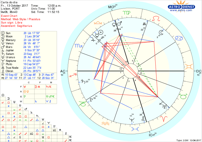 Como mostrar que valemos é o que hoje aspiramos, num desejo de reconhecimento pelo que somos, pela justiça e equilíbrio que demonstramos e pela clareza de ideias com que gerimos os nossos propósitos. A Lua está em Leão e o Sol seu regente em Balança, conjunto a Mercúrio, sextil a Saturno em Sagitário que também está em sextilha ao Nódulo Norte em Leão. Estes são os aspectos construtivos do dia em que temos de lidar em simultâneo com a frustração da quadratura de Saturno a Marte e a tendência para dramatizar da quadratura da Lua a Júpiter em Escorpião. Ou seja, apesar de querermos ter o coração na boca, exprimindo verdades e anseios, nem tudo corre como queremos porque há regras ou forças maiores que reprimem a defesa de alguns pormenores e preferências. Há que fazer o for preciso para, com a ajuda de sextil do Sol ao Nódulo Norte e do semi-sextil de Mercúrio a Marte, defendermos o que achamos justo sem ter que quebrar relações ou acordos. No fundo estamos a preparar a Lua Nova em Balança do próximo dia 19 em que haverá que fazer opções de fundo entre os parceiros que queremos guardar e os que terão de ser cortados porque essa Lua Nova conjunta ao Sol fará oposição a Urano em Carneiro, completando o processo que começou na Lua Cheia de dia 5. É uma sexta-feira 13, para, sem superstição mas com atenção ao futuro, planearmos o que vai ter que em breve ser eliminado ou integrado.