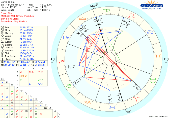 Sábado é um bom dia para nos relacionarmos sem perder o sentido de identidade e para isso estamos prontos a agir de forma independente mas aberta ao equilíbrio das relações, com a entrada de Vénus em Balança e a Lua em Leão, conjunta ao Nódulo Norte e em trígono a Urano em Carneiro. O trígono da Lua a Saturno em Sagitário e a Urano em Carneiro traz simultaneamente uma estabilização da expressão das emoções e a liberdade para as exprimir. A honestidade é recomendada com um quincúncio de Mercúrio em Balança a Quíron em Peixes, a única atitude que ajuda a ultrapassar velhas feridas em vez de as agravarmos com palavras ou uma lógica de diálogo mais virada para agradar aos outros do que a corresponder aos nossos sentimentos. Na viragem de sábado para domingo é tempo de festa com Vénus em semi-sextil a Júpiter a somar-se ao trígono de Fogo entre a Lua, Urano e Carneiro. As relações são o foco do encantamento e é através delas que regeneramos emoções.