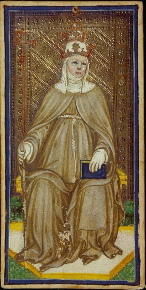 Entendamos como esta carta surge no Tarot: a sua origem radica-se no catolicismo medieval, relativamente ao papel / lugar da mulher na religião. Ora, desde a cultura clássica grega e romana que o regime de patriarcado impunha às mulheres um lugar secundário e subalterno, na sociedade. Durante os primeiros 11 séculos de cristianismo, isso reflectiu-se directamente na forma como a igreja católica a retratava e / ou venerava (só mais tardiamente a Mãe de Jesus é elevada a uma categoria quase divina). Surgem, no entanto, na Idade Média, figuras históricas femininas que se afirmam como intermediárias superiores para a religião, tal como, no final do séc. XIII, a irmã Manfreda Visconti, que foi eleita para presidir como papisa pela ordem religiosa dos Gugliemitas, e queimada pela Inquisição em 1300. Em meados séc. XV, Francesco Visconti, quando casou com Bianca Maria Sforza, encomendou um conjunto de cartas em que uma é dedicada à sua antepassada, apresentada com as suas vestes religiosas e intitulada de Papisa. Nos baralhos posteriores, este lugar ficou assegurado, assumida como a consorte do Papa.