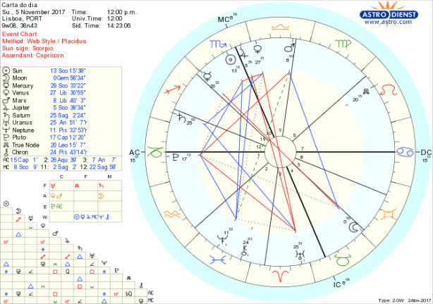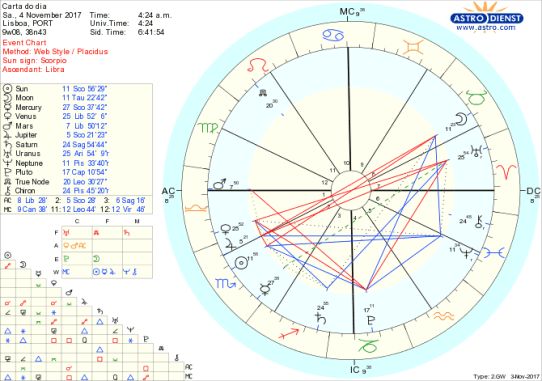 Podemos ou não podemos? Temos ou não temos? Controlamos ou não o que queremos? E que fazer às relações envolvidas se a resposta for negativa? Que acordos respeitar, que alianças deixar? E que surpresas nos podem propôr e como reagir? Neste fim de semana de Lua Cheia em Touro, oposta ao Sol em Escorpião – onde também está Júpiter e Mercúrio – e em que Vénus em Balança se opõe a Urano em Carneiro são imensas as tensões entre a satisfação do desejo pessoal e a possibilidade de partilha equilibrada de poderes, bens, sentimentos. A dificultar ainda mais a razoabilidade necessária, Neptuno erm Peixes faz trígono ao Sol e sextil à Lua permeando de ilusões, ideologia, fé o que move tanto a vontade de controlo e capacidade de ir à guerra como o desejo de segurança material e de satisfação das prioridades emocionais. Vénus oposta a Urano reforça a imprevisibilidade dos encontros , respostas relacionais e consequências e estamos por isso num período de emoções intensas em que dificilmente vemos claro e em que o grande esforço é pormos os pés na Terra e termos controlo sobre nós próprios. No domingo à tarde a Lua entra em Gémeos fazendo-nos hesitar e desejar em simultâneo uma coisa e o seu oposto mas o aspecto a Marte ajuda a fazer novos contactos, encontrar novos interesses e afirmar a nossa vontade – ou vontades- junto de quem nos quiser ouvir. Há que estar pronto para quebrar rotinas e abrirmo-nos a novas possibilidades de relacionamento que respondam à nossa vontade de fazer diferente, com Vénus ainda em oposição a Urano. Dois dias agitados…