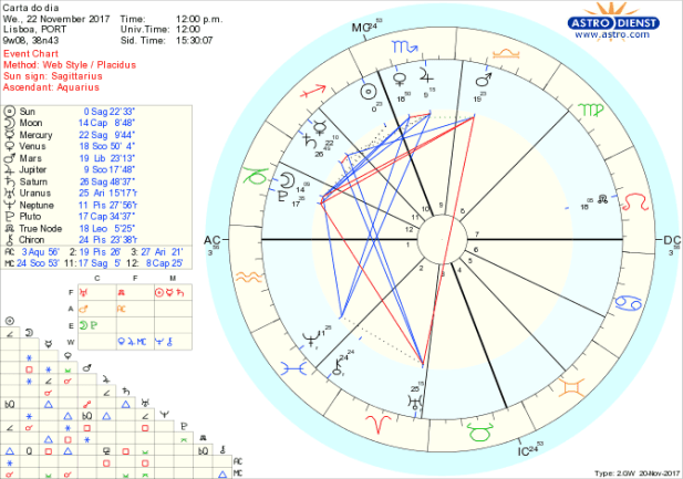 Podemos estar a pensar no futuro mas temos de lidar com um presente complexo em que os conflitos interiores e até os exteriores são difíceis de evitar. A chave está em alinhar razão e coração e estar pronto para embarcar no que pode parecer um destino incerto mas que não o é  porque dele dispomos informações bem delineadas que há que prosseguir. Isto passa-se com a entrada do Sol em Sagitário  e com a Lua em Capricórnio a fazer conjunção a Plutão regente do Escorpião onde estão Júpiter-regente doSagitário- e Vénus, -regente da Balança- em trígono a Neptuno em Peixes, a incitar transformações passionais na ordem das coisas, seguindo ideais, mesmo que haja conflito animado pela quadratura de Lua e Plutão a Marte em Balança.