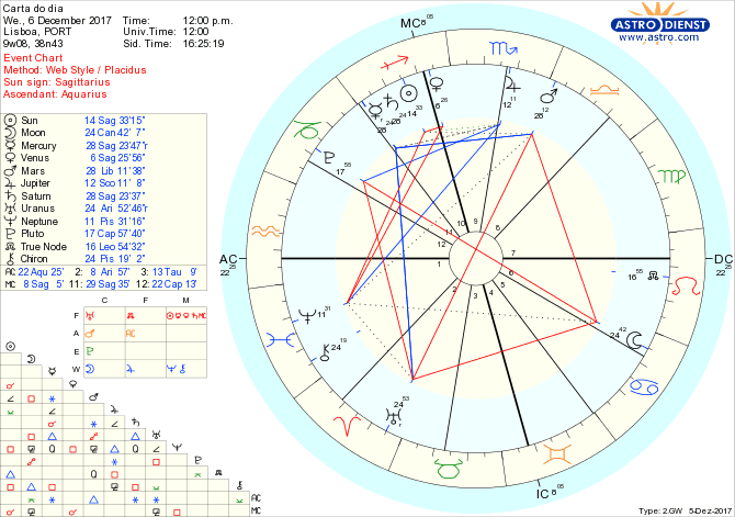 A honestidade tem hoje de guiar a expressão das nossas emoções e capacidades e, para tal, uma auto-avaliação da lógica que nos move e dos sentimentos que nos prendem ao passado é fundamental para podermos avançar num processo consciente de definição das regras e princípios que devem guiar a nossa iniciativa própria e participação no colectivo. A Lua em Caranguejo faz aspectos tensos a Marte em Balança, Plutão em Capricórnio e Urano em Carneiro no que se traduz pela inevitabilidade de conflito de interesses entre a satisfação das carências de segurança emocional e a obrigatoriedade de independentização pessoal face às pressões externas. Quem está ou não connosco e como criamos novas bases quando se nos tiram o tapete debaixo dos pés é o grande esforço de avaliação e reorganização do dia que obriga a repensar seriamente os objectivos a longo prazo, tarefa apoiada pela retrogradação de Mercúrio em Sagitário, conjunto a Saturno. O Sol em Sagitário a caminhar para um trígono exacto ao Nódulo Norte em Leão diz-nos que é a verdade pessoal que nos salva e leva mais longe.