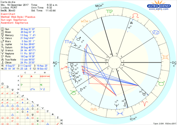 O que fazer com esta informação:  os sinais mais claros são os de que é de facto o tempo de pensar o que queremos a longo prazo e qual é a verdade que nos move pela qual nos estamos dispostos a bater e que nos permite evoluir com um novo controlo dos instintos ou pulsões, a favor de um pensamento articulado e previdente… Estamos há dois anos com Saturno em Sagitário a sentir os limites de uma expansão pouco estruturada, o esforço de articular projectos, de desenvolver conhecimentos, as restrições a migrações e barreiras ao crescimento, tudo a exigir um plano sério, bem pensado, com perspectivas a longo prazo e é nisso que temos trabalhado desde 2015. Agora, mesmo na véspera de Saturno ingressar em Capricórnio, signo que naturalmente rege, temos a sua extraordinária conjunção com o Sol e com a Lua, mas também ainda na órbita de uma conjunção a Vénus. Os outros sinais a considerar são o trígono de Mercúrio em Sagitário ao Nódulo Norte em Leão e o seu semi-sextil a Júpiter em Escorpião e o trígono do stelium da Lua Nova e Saturno a Urano em Carneiro. Não há que enganar, estamos a pensar diferente, vamos apostar em pensar diferente, mas num projecto sério, que corresponda ao que somos, no que acreditamos, a onde queremos chegar.  Chegamos aqui depois de dois anos de depuramento do nosso projecto pessoal, estamos prontos para, a partir dos próximos dias, pormos de pé o que agora temos a certeza que tem de ser. Júpiter regente do Sagitário em sextil a Plutão em Capricórnio abre-nos a possibilidade de mudar a ordem das coisas, libertos que estamos de velhas amarras, mais em controlo, mais fortes, mais seguros do que vamos levar por diante de corpo, mente e alma. Está na altura de apostar em grande no que desejamos que venha a ser o nosso futuro pessoal e colectivo.