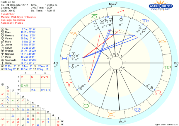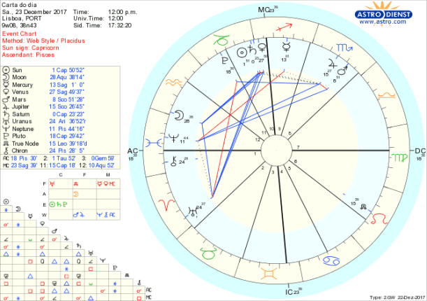 Neste fim-de-semana os Céus reflectem a quadra festiva com uma Lua em Peixes apelando à empatia, ao sonho de um mundo melhor mas Vénus em Sagitário conjunta a Saturno e o Sol em Capricórnio obriga em simultâneo a um olhar realista sobre como atingir esse objectivo, não agora porque tal parece impossível no imediato, mas sim a longo prazo.Não vamos por isso perder a noção das dificuldades, rigor ou responsabilidades que se avizinham, apesar do desejo de evasão ou espírito natalício. Um sesquiquadrado do Sol ao Nódulo Norte em Leão, revela a tensão entre o conservadorismo e a criatividade, entre uma velha segurança e a necessidade de renovação dessa mesma segurança ou estruturas em que nos apoiamos. Há que aceitar que é possível mudar para melhor, com rigor e persistência. Teremos que honrar as promessas que fizermos a nós próprios, com Vénus a entrar em Capricórnio, conjunta a Saturno, no dia 25.