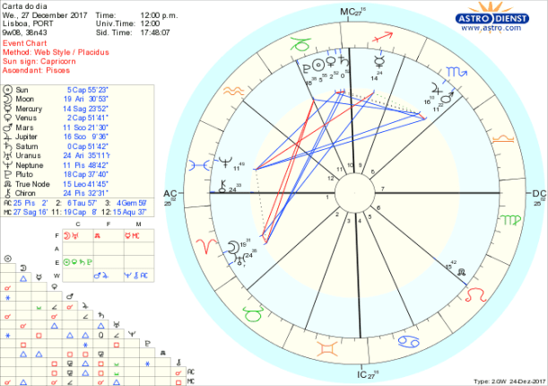 Continuam os Céus a recomendar sobriedade, concentração, responsabilidade para todas as tarefas ou estruturas que nos ocupem com o objectivo de transformar substancialmente a ordem das coisas, do que partilhamos emocional ou materialmente, regenerando pessoal e colectivamente e resolvendo velhas feridas, acabando com velhos padrões de relacionamento, pondo fim a ressentimentos o que permite agir com nova liberdade. A contenção no estabelecimento de uma nova ordem nos assuntos pessoais e colectivos vem da presença de Saturno, Vénus, Sol e Plutão em Capricórnio, este último em sextil à força de regeneração para maior controlo do que é nosso e dos outros assinada por Júpiter e Marte em Escorpião. Fazemos isto com um sonho ou um ideal que nos guia graças ao trígono de Marte e Júpiter a Neptuno em Peixes. Mas a grande revolução interior e a cura dos males da alma que acompanha esse processo externo vem com o semi-sextil de Quíron em Peixes a Urano em Carneiro que já vem de 2009 e vai até 2021. Há esperança para que até lá possamos gradualmente resolver muita coisa, na etapa de hoje e amanhã com a ajuda da Lua em Carneiro capaz de nos levar a tomar iniciativas novas, nesse sentido. Mudar de atitude tem de ser o motor.