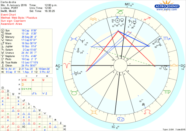 Relações, alianças, acordos, pactos, contractos ou quaisquer entendimentos onde se procurem regras equilibradas de relacionamento levam, neste arranque de semana, um choque transformador. Não há de ser surpresa porque há já tempo que Júpiter e Marte em Escorpião incitam a um mergulho fundo no que tem de ser mudado no âmbito do que partilhamos com os outros, sejam paixões, sexo, dinheiro, bens palpáveis, dívidas ou divisão de poderes. Mas hoje, não só Júpiter e Marte estão conjuntos e em sextil a Vénus, Sol e Plutão em Capricórnio,como a Lua em Balança faz quadratura a Vénus e ao Sol conjunto a Plutão, numa tensão enorme entre a paz ou manutenção do status quo desejado e as mudanças inevitáveis na ordem das coisas. Seja porque temos que aceitar novas parcerias e nova distribuição de poderes, seja porque somos nós que provocamos alterações às bases existentes e atingir objectivos acarreta conflito de interesses, as dinâmicas do dia são potentes e empurram-nos para mais uma etapa da construção da nova ordem de vida pessoal ou colectiva, que se começou a desenhar com a entrada de Saturno em Capricórnio no final de Dezembro. Hoje e amanhã damos passos largos nesse sentido. Podemos dizer basta.
