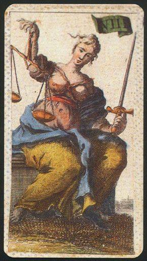 As imagens das cartas são bastante consistentes e recorrem à simbologia da tradição ocidental, na representação de Justiça: uma mulher, empunhando balança e espada, procura ser equilibrada nas decisões, para as executar sem hesitação, em seguida. A diferença é que a Justiça tradicional tem os olhos vendados, como representação da sua neutralidade,enquanto que, no Tarot, é-nos geralmente apresentada de olhos bem abertos, plenamente consciente do processo e também do efeito das suas decisões. A personagem pode surgir antes como um ser alado, angelical, o que lhe permite estar mais elevada em relação à dimensão humana / parcial da visão dos acontecimentos.