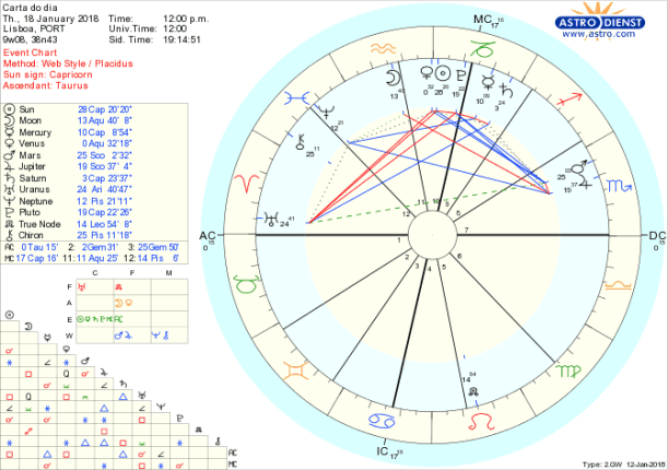 As energias estão a mudar e chegou o momento de nos virarmos para o exterior em busca de apoios ou sensibilidades afins, alinhadas com o projecto de restruturação ou nova ordem iniciado com a Lua Nova de ontem. Ou seja, definido para onde queremos ir a longo prazo, com seis planetas em Capricórnio na Lua Nova, começamos hoje a procurar ecos no que nos rodeia ou no mundo, mesmo que seja apenas nas redes sociais, com a passagem para Aquário da Lua, Vénus e Sol. Como Urano, regente de Aquário está em Carneiro em quincúncio a Marte regente do Carneiro que está em Escorpião, todo o cuidado é pouco para evitar zangas, explosões de mau génio e mesmo acidentes se não canalizarmos para qualquer coisa de construtivo a necessidade de fazer acontecer o que queremos mudar. Há que fazer diferente, inovar, abrir os projectos a novos contributos pela presença dos planetas em Aquário mas essas iniciativas têm de ser em prol do futuro e da abrangência e não do controlo por causa de receios. A semi-quadratura de Mercúrio em Capricórnio a Marte em Escorpião dificulta a flexibilidade negocial ou a apresentação de soluções novas. Torna a comunicação numa discussão e uma discussão numa zanga. O conflito só é evitável se os impulsos forem dominados e se pensar não no poder imediato que se vê ameaçado mas sim em como ganhar terreno a longo prazo. Assim, é um dia com um grande potencial de conquista de novos horizontes ou aliados mas também um enorme potencial de conflito. A gestão tem de ser consciente dos riscos e do respeito das diferenças.