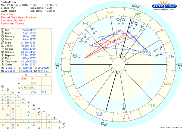 Podemos querer socializar, brilhar, ter iniciativas para encontrar eco ou simpatias mas rapidamente nos depararmos com uma parede de responsabilidade ou limites que podem cortar o sorriso ou o ego mas que lembram a necessidade de mais esforço ou organização e menos impulso. A Lua entra em Carneiro a meio da manhã, GMT, em sextil ao Sol e a Vénus em Aquário no que impele à acção de impacto social mas faz em simultâneo uma quadratura a Saturno em Capricórnio, em vésperas de fazer também quadratura a Mercúrio e a Plutão. Isto serve para recordar que não podemos fazer o que queremos mas sim o que podemos e que tenha sentido a longo prazo, com responsabilidade e cálculos das consequências, como se só ganhássemos o que merecemos e não o que desejamos. Júpiter e Marte em Escorpião continuam a obrigar-nos a ir ao fundo das questões e por isso não só temos de ser sérios como não deixar pedra por revolver na busca de renovação ou regeneração do que está estagnado na partilha de bens, poderes ou sentimentos viscerais. Tudo se joga no grande palco do lugar de cada um no mundo, com Sol e Vénus em Aquário e o seu regente Urano em Carneiro. Que fazer para que nos oiçam com agrado? Ser responsáveis, fazer bem as contas e estar prontos para mudar tudo.
