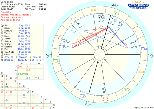 Não é fácil hoje fazermos o que nos apetece, como se não houvesse consequências. De facto todas as iniciativas ou desejos de acção estão limitados por responsabilidades existentes que não podemos ignorar e não vale sequer a pena discutir ou deixarmo-nos ir atrás de respostas de alta tensão, com a Lua todo o dia em Carneiro em quadratura a Mercúrio e a Plutão em Capricórnio e Saturno também em Capricórnio em trígono largo a Urano em Carneiro num sinal claro de que acções inovadoras só se incluirem um plano de estrutura a longo prazo. Um semi-sextil do Sol e de Vénus em Aquário a Saturno em Capricórnio dá-nos a oportunidade de considerar seriamente o que queremos do mundo ou dos grupos com quem temos afinidades. Estar inserido, manter a individualidade e ser apreciado só é possível com grande sentido de responsabilidade, controlo de impulsos e visão da ordem que se pretende para o futuro. Nesta terça feira, com organização, trabalho e disciplina emocional podemos conseguir resultados satisfatórios com a ajuda de Marte e Júpiter em Escorpião em trígono a Quíron em Peixes. Amanhã, com a Lua em Touro em trígono a Saturno temos a mais valia das responsabilidades de hoje.