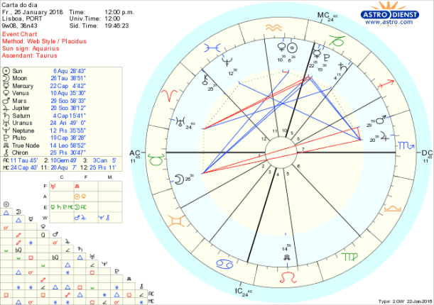 A Lua sai de Touro para Gémeos e Marte sai de Escorpião para o Sagitário onde vai ficar nas próximas sete semanas começando por fazer sextis ao Sol e depois a Vénus em Aquário e no final desse período a Urano em Carneiro, aspectos que prenunciam abertura ao mundo e grandes possibilidades de sucesso em iniciativas de interesse abrangente. Mas para já há que dar os primeiros passos, perspectivando, com curiosidade, a melhor forma de satisfazer o desejo de encontrar eco para as nossas preocupações colectivas, dados os ângulos da Lua e de Marte ao Sol e Vénus em Aquário. Porque Mercúrio regente de Gémeos onde está pela tarde a Lua, transita o Capricórnio, a inquietação que nos assola passa pela comunicação do que se quer estruturar, pela lógica de poder, pela análise da ordem ou projecto a reformular com base em novas ideias, já que Júpiter e Marte estão em recepção mútua, do Sagitário para o Escorpião. Saturno em Capricórnio agora e nos próximos dois anos, dá-nos como obrigação de fundo sermos pragmáticos, responsáveis e pensarmos a longo prazo, mesmo em dias como os de hoje em que partir sem destino ou não cumprir um dever seria o maior prazer…Sem plano não haverá sucesso.