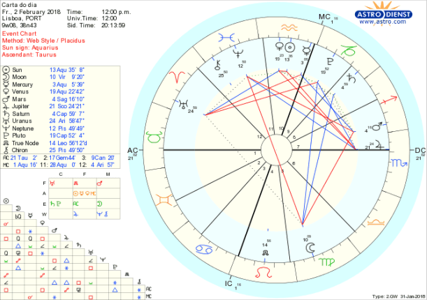 Estamos a lidar com questões práticas, tratamos da saúde, do serviço, das contas, da organização de algo que nos move, mas também há sonho no ar. E pode ser até o desejo de atingir um ideal que nos torne ainda mais aplicados nos processos concretos para fazer mudanças fundas na ordem das coisas. Nisto se passa o dia, com a meticulosa Lua em Virgem em oposição à inspiração de Neptuno em Peixes, em trígono ao Plutão em Capricórnio das revoluções estruturais. A ajudar a propagar o impacto do que temos em mão, um sextil de Mercúrio em Aquário a Marte em Sagitário dá-nos a oportunidade de explicar aos outros o que nos move. Certamente que com esse aspecto queremos ir mais longe, ver mundo ou salvar o mundo mas para isso temos de sair da nossa zona de conforto com Vénus e Sol em Aquário opostos ao Nódulo Norte em Leão. O sextil que perdura entre Plutão e Júpiter dá-nos força para mover montanhas, mas não de repente, pedra a pedra, com a ajuda hoje da Lua em Virgem e no fim-de-semana com os apoios que encontrarmos.