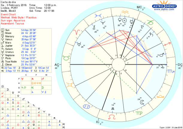 No sábado ainda há rotinas, arrumações, cuidados a ter e só no domingo podemos realmente virarmo-nos para o outro e para os outros explicando o que queremos da vida em conjunto já que esperamos que o mundo nos dê tanto como achamos que damos ao mundo. No sábado a Lua está ainda até cerca das 10 da noite GMT em Virgem para depois entrar em Balança onde pelo meio-dia de domingo faz trígono a Mercúrio em Aquário, signo onde também transitam o Sol e Vénus, sinais de que os grupos, a sociedade, a liberdade de relacionamento e inovação são onde estamos agora mais focados e é nesse espaço colectivo que procuramos novos equilíbrios nas relações, com o trânsito da Lua em Balança.