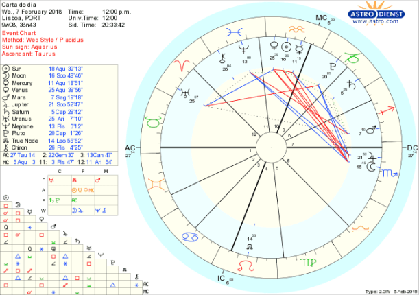Isto acontece numa sequência potente com a Lua em Escorpião a fazer pela tarde sextil a Plutão em Capricórnio e conjunção a Júpiter, depois de uma quadratura ao Sol e antes de uma quadratura a Vénus, ambos em Aquário e de um quincúncio a Urano, regente de Aquário em trânsito em Carneiro. Aquilo que desde ontem ansiávamos pode assim ter novos desenvolvimentos cujo resultado depende da capacidade de perceber onde está a oportunidade de transformar a ordem das coisas- sextil da Lua a Plutão – resolver a tensão sobre o que é o melhor para todos- Lua em quadratura ao Sol em Aquário – e com toda a força das convicções- Lua conjunta a Júpiter em Escorpião- articular iniciativas que nos façam sentir bem com o que damos e recebemos do mundo- quincúncio da Lua a Urano e quadratura a Vénus em Aquário. É um dia para agir com força mas também com o discernimento e perspectiva a longo prazo que Saturno, primeiro regente do Aquário, em trânsito em Capricórnio, obriga.