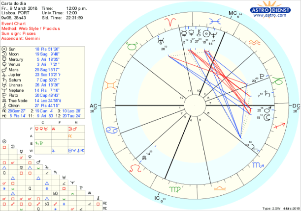 Estamos hoje prontos para partir para novas aventuras, investimentos, horizontes de conhecimento, em iniciativas individuais, audazes, que dêm outra ordem à vida mas é preciso acautelar velhas feridas e carências que se podem revelar por não nos sentirmos acompanhados nesse impulso regenerador. A Lua faz conjunção a Marte em Sagitário e trígono a Urano em Carneiro e estes aspectos dão o Fogo às iniciativas que no fundo se destinam a completar processos de transformação em curso porque desde ontem Júpiter está directo em Escorpião – regido por Marte- e Mercúrio está no ponto a que vai voltar quando entrar directo a 17 de Abril depois de estar retrógrado a partir de 24 de Março. Como a Lua e Marte fazem semi-sextil a Plutão em Capricórnio e quadratura a Quíron em Peixes, é desses aspectos que advem a oportunidade de fazer mudanças grandes na ordem das coisas que possuimos, controlamos ou em que participamos e também o risco que se reabram feridas de entendimento porque nos sentimos pouco acompanhados nessa aventura- mas também pode ser que porque estamos sós que temos de encontrar a energia que nos faça ir em frente sem hesitações nem mão dada. O importante é sabermos comunicar o que nos move e demonstrar a inteligência do propósito. Mas atenção, estamos a completar processos e tudo deve ser visto sob essa perspectiva.