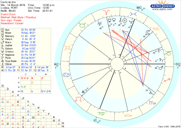 b- dominar excessos e agir com propósitos bem definidos ou limitados para potenciar resultados e assim ultrapassar a frustração da quadratura de Vénus a Saturno e os conflitos da quadratura do Sol num solstício quadrado a Marte, particularmente difíceis, na véspera desse solstício, dia 19 em que a Lua depois de fazer quadratura a Plutão faz conjunção a Urano: há emoções, instintos, impulsos que não são compatíveis com a nova ordem desejada e dia 19 seja porque nos esticamos, seja porque somos surpreendidos, teremos de rever dependências emotivas.
