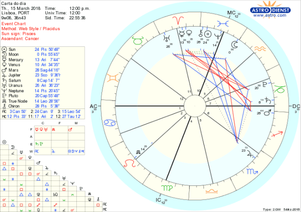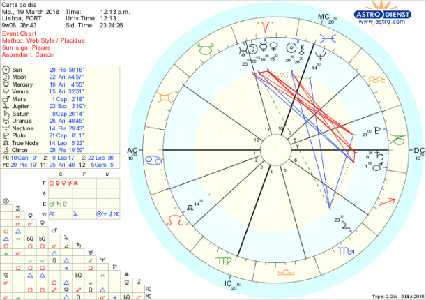 Da Lua Nova até ao equinócio dia 20 quando o Sol entra em Carneiro há uma permanente tensão, um teste para vermos de somos capazes de revelar de forma construtiva e não destrutiva o que queremos mudar na ordem das coisas, já que o Sol estará em quadratura a Marte seu regente recém entrado em Capricórnio. A frustração ou conflito, interno ou face a inimigos pessoais ou estruturais- também podemos estar a lutar contra a burocracia..- só se resolvem com um olhar diferente sobre as suas causas. A zanga tem de ser canalizada energicamente para a materialização de objectivos, com a ajuda no dia 20 do trígono de Marte à Lua em Touro.