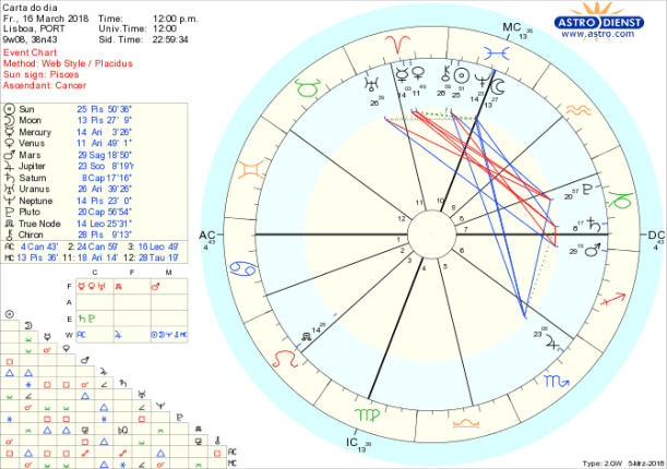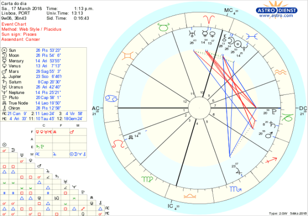 Durante este período temos dois tempos chave: a Lua Nova em Peixes no dia 17 e o ingresso do Sol em Carneiro no dia 20 pelas 4 da tarde GMT. Até à Lua Nova, o desafio de dias 14,15 e 16 é o de identificarmos os valores espirituais, amorosos, de empatia, compaixão ou dádiva que queremos como pano de fundo para a nossa actuação. Nestes dias, Marte está ainda em Sagitário a dar mais fogo às ideias, ao que sentimos como verdade a defender, à abertura de horizontes físicos e mentais. No dia 17, dia da Lua Nova em Peixes – data em que resolvidos esses desafios já devemos ser capazes de unir corpo e alma no mesmo propósito, -Marte entra em Capricórnio a dar-nos a força para mover montanhas com base na nossa crença funda do que está certo e onde queremos chegar. Para além da acção é também preciso comunicação e é importante também nesta Lua Nova exprimir a vontade- que gostamos, em que apostamos, o que nos apaixona sem hesistação- com Mercúrio e Vénus conjuntos nesse dia em Carneiro, em trígono ao Nódulo Norte em Leão.Essas vontade já vêm depuradas de excessos de entusiasmos ou propósitos menos razoáveis porque nos dias anteriores à Lua Nova Vénus em Carneiro esteve em quadratura a Saturno em Capricórnio e nós a sentirmos os custos envolvidos em todas as apostas e a ter de refrear o desejo.
