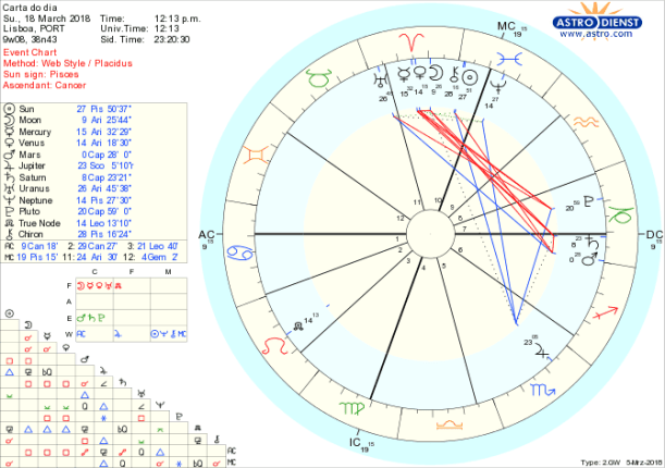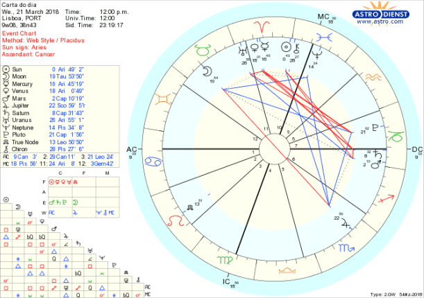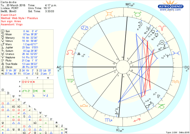c- no dia 20, equinócio em que o Sol entra em Carneiro, agir com mais determinação na busca da materialização do que definimos como aspiração na Lua Nova. Mas essa afirmação de vontade só tem bons resultados se nada for deixado ao acaso e tudo fizer parte de um plano de futuro: o Sol faz quadratura a Marte seu regente conjunto a Saturno em Capricórnio, com a Lua em Touro em trígono a Plutão também em Capricórnio, dia 21.