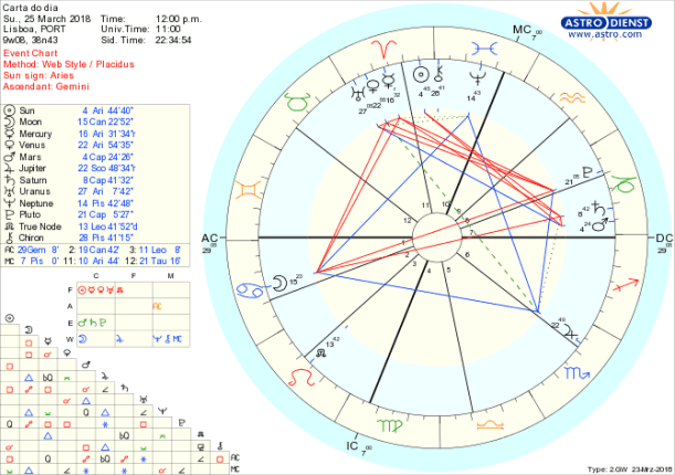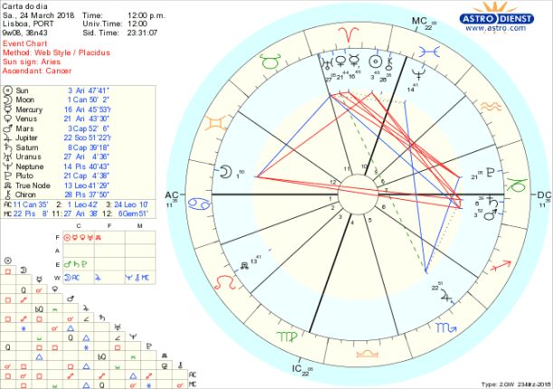É um fim-de-semana em que o potencial de conflitos, frustração, ansiedades, revoltas ou estragos é enorme. Por um lado, temos de repensar o que queremos ou a lógica desse querer com Mercúrio retrógrado em Carneiro até Abril – detalhes no texto de ontem. Mas temos em simultâneo o ímpeto de avançar impetuosamente, apaixonadamente, de exercitar a vontade sem restrições, com o Sol, Vénus e Urano em Carneiro. Assim, deveríamos pensar antes de agir porque os efeitos colaterais do impulso cego fazem-se sentir com Marte, regente do Carneiro conjunto a Saturno- o que se traduz num muro de restrições, limites e regras que condicionam o querer- e com Vénus quadrada a Plutão em Capricórnio que amplifica a intensidade do desejo de dominar as relações pessoais, financeiras, políticas e que por isso suscita também as maiores resistências. Tudo isto é lenha para a fogueira que a quadratura de Marte ao Sol acende e que causa a maior insegurança e mais conflito com outra quadratura do Sol à Lua em Caranguejo oposta a Marte. Assim se passa o sábado para no domingo, mantendo-se os restantes aspectos e por isso as mesmas tensões, termos a acrescentar a oposição da Lua a Plutão e quadratura a Urano, trígono a Neptuno em Peixes e Júpiter em Escorpião, numa enorme exacerbação das emoções, ilusões, ou ideologias pretexto para o conflito que queremos que nos liberte das restrições ou da ordem existente. Não são dias fáceis, são dias de grande responsabilidade para conseguirmos manter a calma sem perder terreno e, com sentido crítico, sermos capazes de mudar nós próprios sem o exigirmos apenas dos outros. Mas também pode ser preciso ir à luta…