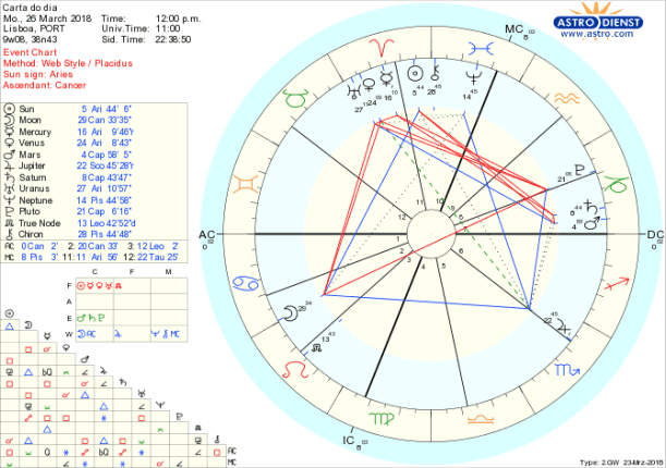 É difícil ter posições consistentes neste arranque de semana em que apesar do desejo de segurança emocional, familiar, doméstica, nacional, tudo parece conjugar-se para nos surpreender com desenvolvimentos inesperados ou com as nossas próprias acções impulsivas, atrás da quadratura da Lua em Caranguejo a Vénus e a Urano em Carneiro, depois de um fim-de-semana agitado por tensões de vontades e resultados. Essas tensões não desaparecem esta segunda-feira, nem tão depressa. Marte e Saturno estão conjuntos em Capricórnio em quadratura ao Sol em Carneiro no que são aspectos de fortíssima tensão pessoal e colectiva, frustração de vontade, controlos ou restrições a iniciativas, em moldes que podem até ser violentos. Vénus em Carneiro em quincúncio a Júpiter em Escorpião estímula ainda mais a apetência por investimentos pessoais, políticos ou financeiros de grande atractivo mas de fracas garantias e a conjunção de Vénus a Urano até dia 28 – assim como a Éris, – planeta do caos- ontem hoje e amanhã, traduz-se numa verdadeira montanha russa de desejos e resultados, apenas controlável se formos nós a abrir mão da necessidade de estabilidade, posse material ou amarras emocionais. Nada dá garantias. Pelo final do dia a Lua entra em Leão e faz trígono ao Sol em Carneiro, um aspecto de Fogo que nos leva a querer reconhecimento pelo que defendemos e por quem somos. Mas a frustração, restrições, limites, responsabilidades mantêm-se.