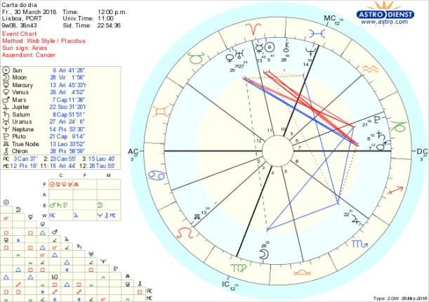 Estamos a aproximar-nos da Lua Cheia em Balança, amanhã, e sentimos desde hoje à tarde a dificuldade que até lá se extrema em conciliar o que queremos com o que pode ser acordado.Hoje pela manhã, com a Lua em Virgem, é ainda possível estar atento aos detalhes, contas e aspectos práticos do que queremos mudar mas, pela tarde a Lua entra em Balança e a inquietação volta-se para os relacionamentos, acordos, tudo o que implique um novo equilíbrio das relações sejam elas pessoais, financeiras ou políticas. Como Vénus regente da Balança está há dias e hoje também conjunta a Urano em Carneiro, a vontade de mandar tudo ao ar é grande mas não pode ser. Uma persistente conjunção de Marte e Saturno em Capricórnio ainda em órbita de quadratura ao Sol em Carneiro – e por isso amanhã em quadratura à Lua Cheia, impede-nos de fazer o que nos apetece porque há regras e limites a cumprir. Difícil é aceitar essas restrições por isso são dias de tensão entre o que queremos e o que podemos. Mercúrio retrógrado em Carneiro em trígono ao Nódulo Norte em Leão dá o bom conselho de pensar melhor antes de definirmos posições.