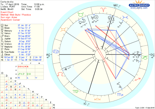 Hoje é um dia de sentimentos intensos mas complexos já que por um lado aspiramos à estabilidade financeira, material, física com a Lua conjunta a Vénus em Touro- aspecto que pode mesmo levar a excessos na busca de satisfação dos sentidos e das garantias- e por outro queremos agir com espontaneidade, livremente, sem dar contas a ninguém nem nos preocuparmos com as consequências, com o Sol hoje e amanhã conjunto a Urano em Carneiro. Acrescentar intensidade, paixão e profundidade aos sentimentos temos Vénus a fazer trígono a Plutão em Capricórnio o que permite defender com unhas e dentes o que se quer assegurar nas relações pessoais, financeiras, sociais. É difícil temperar o que se quer dizer porque os bloqueios parecem surgir de todos os quadrantes, agora e até ao fim do mês com Mercúrio em Carneiro em quadratura a Saturno em Capricórnio. Uma coisa é certa, mas ter a compreensão hoje que para resolver o que quer que seja temos de agir e não ficar à espera de compaixão. Se não lutarmos pelo que queremos ninguém vai fazer por nós e isso é um novo indicador nos Céus com a saída hoje de Quíron de Peixes e entrada em Carneiro. Quíron vai voltar retrógrado a Peixes ainda este ano mas este ingresso em Carneiro vai já acender uma luz interior que nos diz que sarar feridas antigas ou recentes está apenas nas nossas mãos.