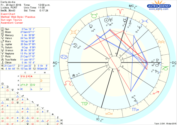Solidificar a nossa segurança emocional e material, resolver coisas em casa, em família, criar rotinas, respeitar tradições são apelos fortes hoje com a Lua em Caranguejo em sextil ao Sol em Touro e Vénus também em Touro. Os valores palpáveis, os bens em que estamos investidos, as garantias a que nos podemos agarrar são o foco das atenções depois das alterações da última semana em que o exercício da vontade pesou mais do que o custo das consequências. Por isso, para obter os resultados seguros a que aspiramos, há que ter sentido prático e tratar de assuntos básicos tentando evitar as confusões ou ilusões que derivem da semi-quadratura do Sol a Neptuno em Peixes. Ou seja, corremos o risco de pensar que não há riscos nem custos porque rejeitamos inconscientemente mais instabilidade. Mas o sextil de Neptuno a Marte e trígono a Júpiter também nos pode inspirar, com compaixão a dar tudo por tudo para resolver situações, saindo renovado de situações que exigem restruturações profundas, desde obras em casa, mudanças profissionais e forma de ganhar a vida ou amarras emocionais que exigem novos valores. Nos próximos 30 dias o Sol vai estar em Touro com Saturno retrógrado em Capricórnio, dois signos de Terra, o primeiro a pôr o foco no que queremos realmente valorizar e o segundo a forçar as revisão da ordem das coisas para que possamos investir no que acreditamos valer a pena.