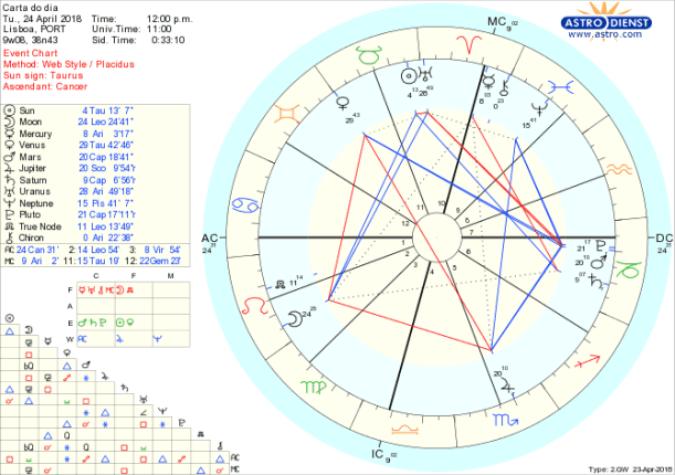 A possibilidade de especular ou ter iniciativas criativas, reveladoras de uma outra dimensão do entendimento e capacidade de acção é hoje estimulada por um trígono libertador entre a Lua em Leão e Urano em Carneiro a que se soma um sextil entre Júpiter em Escorpião e Marte em Capricórnio que nos traz as oportunidades desejadas para romper com as estruturas e limites existentes e renascer das cinzas seja financeiramente seja em termos de poder real ou do espírito. No entanto, apesar de todas as possibilidades que se abrem não podemos ir a acelerar. Mercúrio em Carneiro está hoje e nos próximos dias em quadratura a Saturno em Capricórnio o que obriga a contenção na expressão da vontade e respeito pela ordem hierárquica ou das coisas. Pela noite Vénus entra em Gémeos e vemos vários caminhos que nos agradam mas que têm de ser bem estudados quando a Lua entrar de seguida em Virgem.