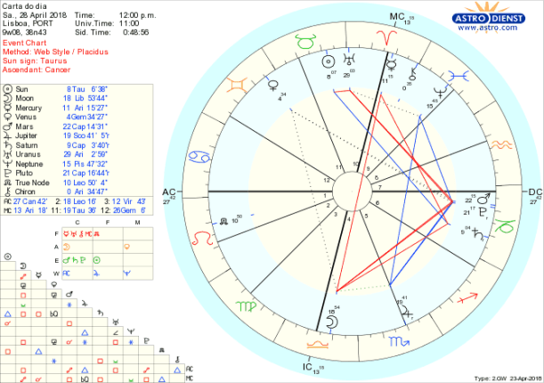 O mais relevante este fim-de-semana é que podemos de certa forma antecipar o que se vai desenrolar a partir de 15 de Maio. Os passos são os seguintes: estamos em vésperas- será na madrugada de segunda-feira- de uma Lua Cheia em Escorpião, o climax das tensões entre o que é nosso e o que temos de partilhar ou melhor entre o que valorizamos ou seguramos e o que desejamos controlar, emocional, material, financeiramente ou em termos de poder. No sábado, a Lua ainda em Balança, apela ao equilíbrio de forças mas este é fortemente abalado por uma quadratura a Plutão a que se segue uma oposição a Urano antes da entrada da Lua em Escorpião pelas 7 da manhã GMT de domingo.Isto aponta para a necessidade, – a bem ou a mal, ou seja, liderando nós próprios os processos ou sendo sujeitos a forças maiores, – de abrir mão dos equilíbrios ou paz existentes para entrar num terreno desconhecido em que desconfiamos do que não controlamos ao mesmo tempo que ansiamos fortemente à estabilidade material, financeira, política, social. Trata-se de uma grande volatilidade a todos os níveis e é o que dela se salvar, nas próximas duas semanas, que servirá como âncora na Lua Nova de Touro no próximo dia 15 de Maio. Ora nesse dia 15 de Maio, não só temos a Lua Nova num signo regido por Vénus que transita o ambivalente Gémeos, como também Urano, o planeta das revoluções, inovação, liberdade, internet, entra em Touro, conjunto a Mercúrio que rege Gémeos, planeta das comunicações, transações, comércio, lógica- o que exacerba toda a volatilidade nessas áreas. Quando a Lua entrar, este fim-de–semana, em Escorpião, vai espelhar tudo o que desejamos garantir e que será sujeito a alterações de fundo na Lua Nova. Há que estar atento ao que queremos atingir e preparar o terreno para minimizar percas e danos.O sextil da Lua Cheia a Saturno diz-nos que só com perseverança e uma perspectiva a longo prazo é que ultrapassaremos ansiedades e dificuldades.
