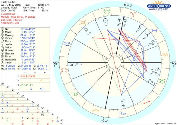 Podemos querer sonhar mas vamos ter de dar forma às fantasias já que hoje é impossível sentirmo-nos bem se nos ficarmos apenas por divagações. Mas, não só estruturar sonhos é difícil, apesar de potencialmente benéfico – com a Lua em Peixes em semi-quadratura a Plutão e sextil a Saturno, ambos em Capricórnio, – como a oposição do Sol em Touro a Júpiter em Escorpião, desde ontem e nos próximos dois dias, nos leva a oscilar entre posições conservadoras e revolucionárias sendo complexa e confusa a escolha de um meio termo com Vénus regente do Touro em Gémeos em Neptuno em Peixes. Esta posição de Vénus e suas ligações a Neptuno e quincúncio a Júpiter permitem ver muitos caminhos todos envolvidos em brumas, não sendo por isso o bom momento para tomar decisões. O escapismo é um risco e há que controlar indulgências ou preguiça e dar os pequenos passos para começar a fundamentar qual o ponto de partida onde queremos estar na próxima Lua Nova de Touro.