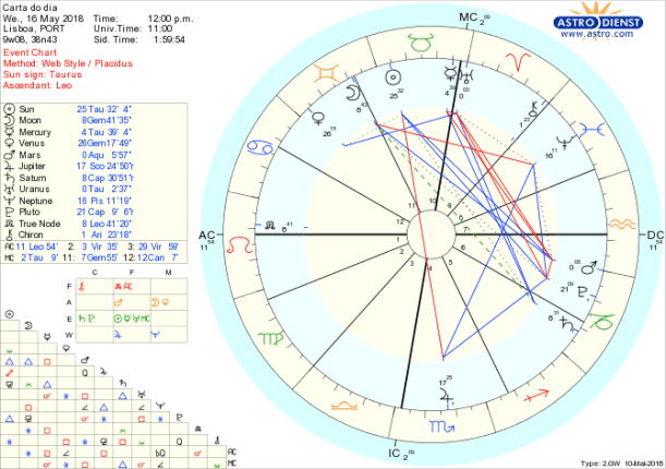 Vénus que rege o Touro está em Gémeos, assim como a Lua o que inflaciona ambivalências todas justificáveis com Mercúrio regente dos Gémeos em Touro a dar-lhes corpo mas porque Mercúrio está também em quadratura a Marte em Aquário e praticamente conjunto a Urano, todos os impulsos e razões vão acabar por se traduzir em conflito, pessoais ou colectivos. Marte em Aquário quer mudança e não quer esperar. Urano em Touro também quer mudança de valores e também não quer esperar e assim, hoje e ainda mais três vezes durante o próximo mês e meio, vamos estar sujeitos, por causa das retrogradações de ambos, a choques extremos de interesses e impactos que nos podem afectar a nível individual ou como sociedade organizada em torno de valores que deixam de ser valores seguros. São tensões antigas que apesar de apaziguadas de repente de novo irrompem, são convenções que acabam subitamente, é um lado nunca visto que se revela e em todas estas circunstâncias somos confrontados com um mundo que muda e com a necessidade de segurança que parece estar a falhar. Apenas um trígono de Mercúrio hoje e nos próximos dias nos permite, se disso conscientes, escolher bem as palavras para exprimir o que desejamos construir a longo prazo. Mas vai ser preciso falar firme para segurar a crise dado o potencial de rupturas com as energias soltas de Urano e Marte.