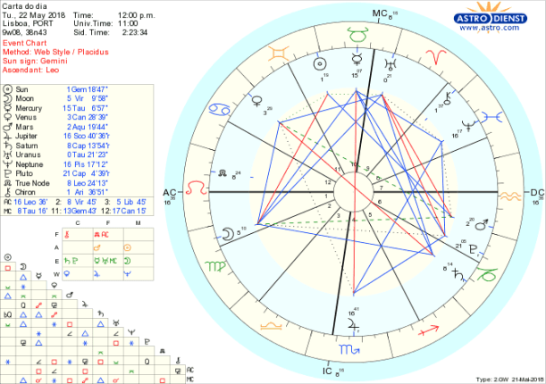 É possível hoje exprimir em detalhe o que se pretende transformar para estabelecer as bases emocionais que desejamos, no entanto é preciso contenção e planeamento a longo prazo. a análise e comunicação dos valores que queremos defender é facilitada pelo trígono da Lua agora em Virgem a Urano em Touro, a Mercúrio seu regente também em Touro e a Plutão em Capricórnio, num grande aspecto fluido de Terra que simboliza a materialização do que Vénus em Caranguejo oposta a Saturno em Capricórnio implica como criação de ninho, rotinas, bases securizantes, dentro de estruturas bem definidas, num cálculo racional do que será bom a longo prazo. O Sol desde ontem em Gémeos e hoje ainda em trígono a Marte em Aquário reforça a comunicação, divulgação e busca em várias frentes de projectos inteligentes cuja lógica passe pela oposição de Mercúrio a Júpiter em Escorpião, ou seja, pela possibilidade de reciclarmos, regenerarmos, expandirmos novos valores numa base de partilha também regenerada.