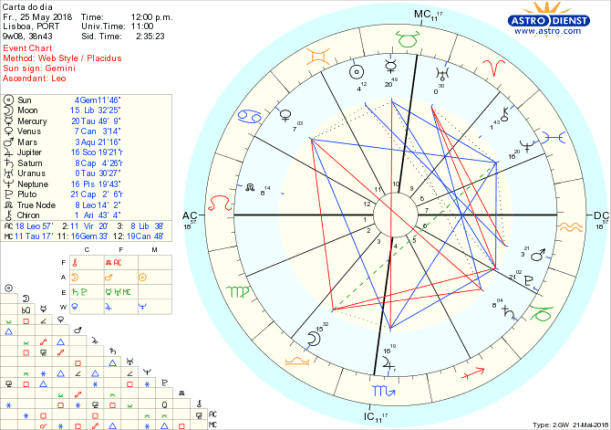 É preciso encontrar novos equilíbrios e formular novas propostas de forma a conseguir uma reorganização das coisas e da distribuição de poderes. Há que sair da zona de conforto e aceitar normas diferentes baseadas em valores inovadores e apostar na comunicação para fazer verdadeiras revoluções a todos os níveis. Com o Sol em Gémeos em trígono a Marte em Aquário e sextil ao Nódulo Norte em Leão sabemos exprimir com impacto a nossa lógica pessoal, agora a defender inovação ou novos investimentos, com Mercúrio e Urano em Touro, o primeiro num trígono a Plutão que garante resultados fluidos e o segundo em quadrado a Marte a pedir alguma contenção de forma. É grande a possibilidade de ir ao fundo das questões e obter resultados transformadores mas há que ter abertura e honestidade intelectual sem medo de ser forçado a reformular bases de segurança emocional ou novos equilíbrios nas relações, com Vénus em Caranguejo oposta a Saturno em Capricórnio e a Lua em Balança em quadratura a Plutão. Em suma, hoje não devemos deixar que o medo de perder controlo domine a lógica e quanto mais aprofundarmos tudo o que deve ser resolvido mais facilmente aceitamos alterações em relações, contratos, acordos, sem perder a face e convictos de que vamos para melhor graças ao trígono de Júpiter em Escorpião a Neptuno em Peixes.