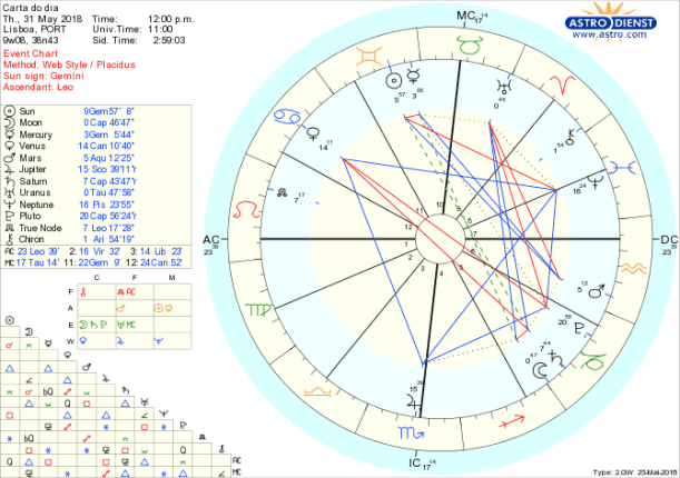 Hoje há que pensar seriamente como podemos fazer diferente e ganhar com isso a longo prazo. Ambicionamos ordem, estrutura, até poder mas para isso há que usar novos instrumentos, apostar em ideias novas, novos investimentos seja qual a for a sua natureza desde que representem segurança emocional e/ou financeira. A entrada da Lua em Capricórnio em trígono a Urano em Touro favorece a procura do que vai fazer a diferença e a conjunção mais tarde da Lua a Saturno obriga ao pragmatismo e à perspectivação a longo prazo. Como se mantém o trígono de Vénus em Caranguejo a Júpiter em Escorpião e a Neptuno em Peixes podemos continuar a sonhar e a desenvolver esforços para reformar ou reformular o ideal que desejamos como casa, família, rotinas ou mesmo como nação. Assim,  com os trânsitos da Lua podemos hoje tratar seriamente de planear o que, pelos aspectos de Vénus, idealizamos que nos dê maior segurança e bem-estar seja pelo afectos, pela casa,  pela bolsa ou por quem estamos rodeados.